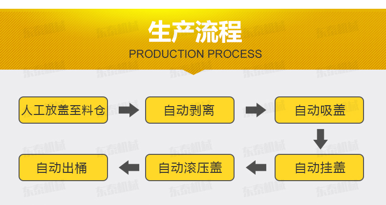 人工放蓋至料倉(cāng)——自動(dòng)剝離——自動(dòng)吸蓋——自動(dòng)掛蓋——自動(dòng)滾壓蓋——自動(dòng)出桶——一個(gè)循環(huán)完成。