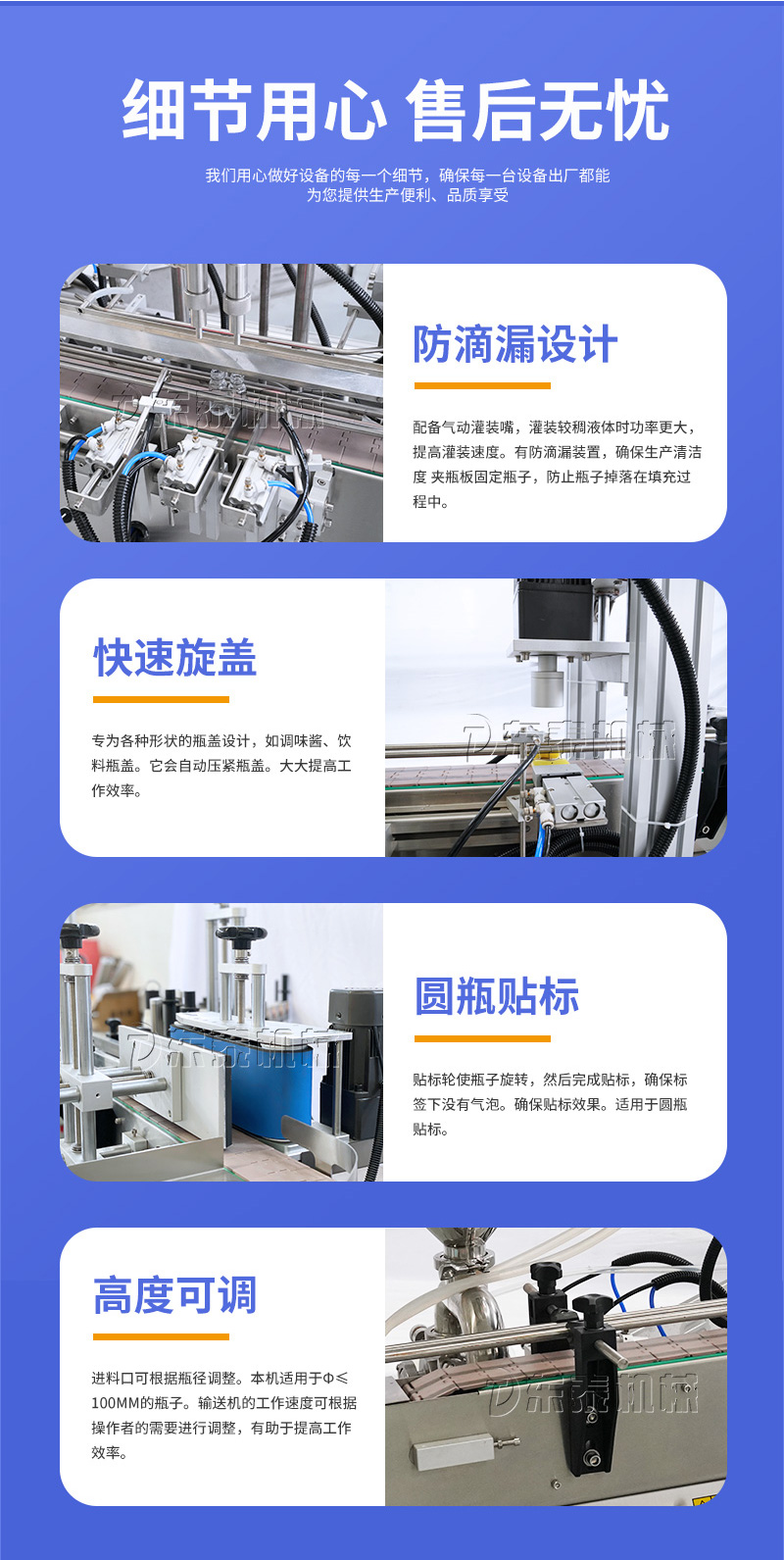 產(chǎn)品說明:生產(chǎn)線根據(jù)灌裝范圍選擇型號,灌裝部分為雙頭下潛式灌裝機,適用于不同物料不同瓶子的灌裝,配備自動壓蓋機和圓瓶貼標(biāo)機,可實現(xiàn)不同蓋子的旋蓋貼標(biāo)工作。