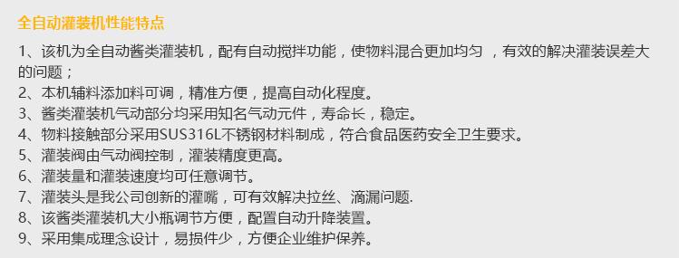灌裝機(jī)采用活塞式灌裝原理,適用于調(diào)味品中帶顆粒并且濃度較大的辣椒醬、豆瓣醬、花生醬、香菇醬、果醬、牛油火鍋底料、紅油火鍋底料、蝦醬等較為粘稠醬類的灌裝。
