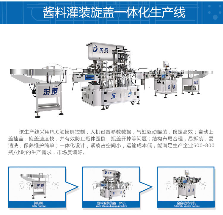 醬料的銷售情況直接關(guān)系到市場的發(fā)展,而醬料要想有一個好的銷量的話,就需要有好的質(zhì)量作為保障的,而這個保障就是給予醬料好的灌裝效果,所以這也使自動化醬料灌裝機(jī)成為了各企業(yè)生產(chǎn)包裝的得力助手,能有效的完成灌裝任務(wù),在規(guī)格化標(biāo)準(zhǔn)化中更加合理化,對各種醬料不僅起著保護(hù)的作用,還更為企業(yè)創(chuàng)造著更多的方便,正是因為我們東泰一直以來都是敢于挑戰(zhàn)、敢于創(chuàng)新和突破讓自己的實力在市場有了很大的進(jìn)步,來推進(jìn)醬料企業(yè)生產(chǎn)之后,從而帶來各個領(lǐng)域的快速的發(fā)展。