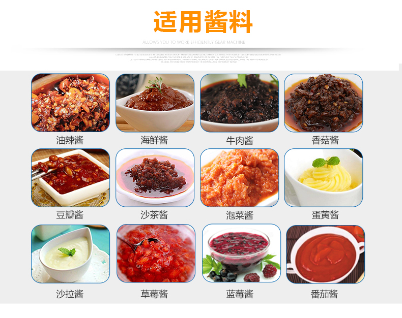 灌裝機采用活塞式灌裝原理,適用于調味品中帶顆粒并且濃度較大的辣椒醬、豆瓣醬、花生醬、香菇醬、果醬、牛油火鍋底料、紅油火鍋底料、蝦醬等較為粘稠醬類的灌裝。