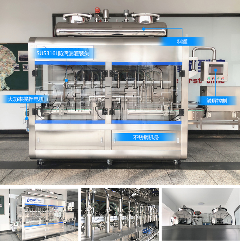3、 該設備在設計上大大縮短了下料斗到灌裝頭的灌裝距離,克服了含油量大的物料(如:含芝麻粒的辣椒油)在灌裝過程中出現(xiàn)的有些瓶油多,有些瓶醬多的灌裝誤差大的缺點。
