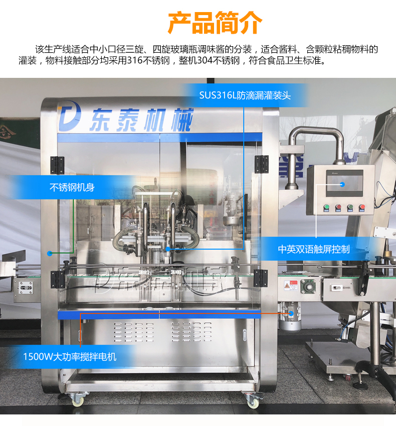 東泰機械通過十多年的努力和發(fā)展,現(xiàn)已成為集科研、設計制造、成套供應、技術咨詢服務、工程總承包為一體的高科技型企業(yè)。如今專業(yè)的東泰技術團隊根據(jù)醬料市場研發(fā)推出的牛肉醬定量灌裝機設備得到市場的認可和用戶的青睞。同時這款自動化、智能化、效率化、功能化的醬料灌裝機械設備帶領著醬料市場進入規(guī)模化的生產領域中,為相應企業(yè)提供方便、快捷、省時省力的現(xiàn)代化快節(jié)奏的發(fā)展。如果您有需求,歡迎您到東泰機械實地考察選購!